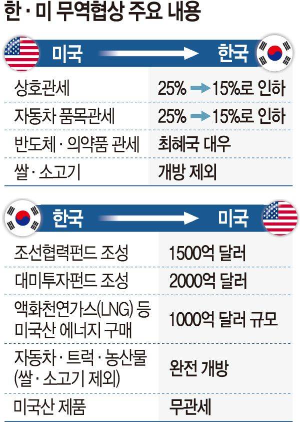 한·미 양국이 31일 합의한 상호관세 15%, 자동차 품목관세 15%는 경쟁국과 대등한 수준이다. 한국은 여기에 향후 부과가 예고된 반도체, 의약품 관세 협상 때도 다른 나라에 불리하지 않게 ‘최혜국 대우’를 받기로 하는 등 레드라인을 지키는 데 성공했다.