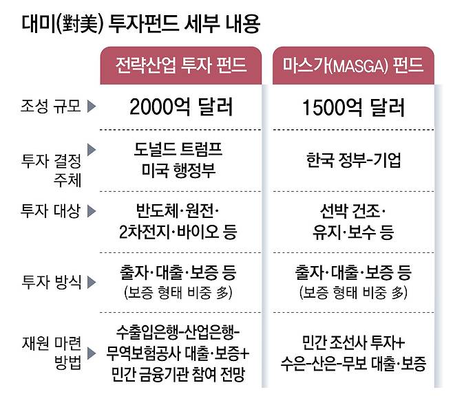 관세 타결의 ‘키’가 된 대미 투자 펀드는 반도체, 원전, 2차전지, 바이오, 핵심 광물 등에 투자하는 2000억 달러 규모 ‘전략산업 투자 펀드’와 미국의 조선업 부흥 목표에 부응하기 위한 1500억 달러 규모 ‘마스가(MASGA·Make American Shipbuilding Great Again) 펀드’로 나뉜다. 전략산업 투자 펀드는 투자 의사결정권이 전적으로 트럼프 대통령에게 있고 한국 측이 대출이나 지급보증을 제공하는 방식으로 운영될 것으로 전망된다. 반면 마스가 펀드는 한국 정부와 조선사들이 주도하는 일반 펀드라는 점에서 차이가 았다.