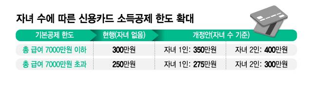 총급여 7000만원 이하 가구의 신용카드 소득공제는 기본 300만원에 자녀 1인당 50만원씩 최대 100만원이 추가된다. 자녀 2명 이상 가구는 최대 400만원까지 공제받을 수 있다.