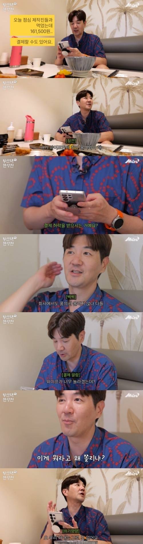 이어 "총 금액이 16만1500원이면 와이프가 너무 놀라겠다"며 '오늘 점심 제작진들과 먹었는데 16만1500원 결제할 수도 있어요. 반반확률이래요 오케이?'라며 자발적으로 문자를 보냈다.