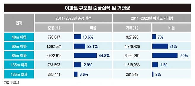 월용청약연구소에 따르면 2011년부터 2023년까지 전국 주택 준공실적의 44.8%, 아파트 거래량의 50%를 85㎡ 이하 타입이 차지했다. 1~2인 가구가 급증하고 있는 지금도 84㎡ 타입의 공급 비중과 인기는 아래 단계인 59㎡에 비해 높은 편이다.