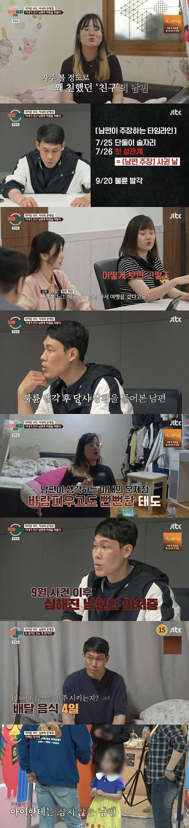남편의 집착에 모두가 경악한 상황. 그 집착의 이유가 밝혀지면서 충격을 줬다. 알고 보니 아내가 지난해 절친한 친구의 남편과 바람이 났던 것. 아이를 데리고 부부 동반으로 놀러다닐 정도로 가까운 사이였으나, 친구가 둘째 임신을 하면서 술을 마시지 못하게 되자 친구 남편과 아내가 단둘이 술을 마시게 되면서 불륜으로 번졌다.