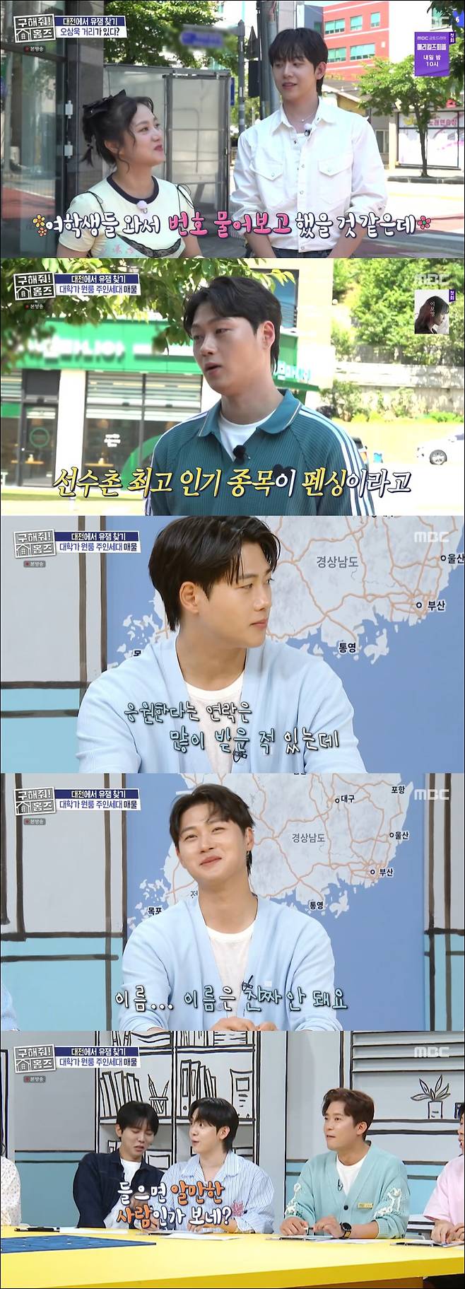 대전 임장을 위해 돌아다니던 세 사람은 '오상욱 거리'를 발견하고 깜짝 놀랐다. 오상욱이 대전의 아들이기 때문. 오상욱은 '오상욱 거리' 탄생 배경에 대해 "처음에 연락이 왔다. 거리를 만들고 싶다 해서 길을 고르라고 세 가지를 정해주셨다"며 "저는 원래 다른 데를 골랐는데 대전 상인 분들의 투표도 있었을 것"이라 밝혔다. 양세형은 "그럼 왜 고르라 한 거냐"고 물었고 오상욱은 "저는 두 표로 쳐주지 않았을까 싶다"고 밝혔다.