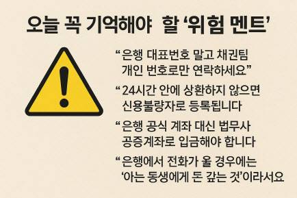 그는 상환 방법으로 “은행 계좌가 아닌 법무사 공증계좌를 통해야 한다”는 조건을 붙였다. 사고로 인한 대출금 상환이기 때문에 거래기록을 남기면 안 된다는 이유였다. 이어 “법무사 이름은 이민주, 계좌는 123 456 7890”이라고 구체적 정보를 제공했다. 또한 “은행에서 전화가 갈 수 있는데, ‘법무사와는 10살 차이 나는 아는 동생, 송금 이유는 사업자금 상환’이라고만 답하라”고 세세히 지시했다. 금융사의 모니터링 시스템마저 회피하도록 한 치밀한 조작이었다.