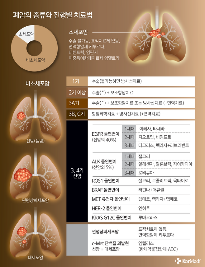 "폐암은 크게 소(小)세포암과 비(非)소세포암으로 나눈다. 전체의 20%를 차지하는 소세포암은 암이 빨리 악화하고 수술이 불가능하다. 일부 환자에게 뇌의 통증과 기능을 관리하기 위해 전뇌방사선치료를 했는데, 최근 면역치료제가 생명을 의미있게 연장하고 있다. 나머지 80%인 비소세포암은 1, 2기와 3A기에 수술을 우선 적용할 수 있으며 수술이 힘들면 방사선치료를 받는다. 재발을 낮추기 위해 보조항암치료도 받는다. 3B기, 3C기엔 항암화학치료와 방사선치료, 면역치료 등을 병행한다. 비소세포폐암의 80%를 차지하는 선암(腺癌·샘암)은 다양한 표적치료제로 치료하고 면역항암제를 곁들인다. 표적항암제는 혈액검사로 해당하는지 체크하고 투약한다. 15~20%를 차지하는 편평상피세포암은 아직 표적치료제는 없고 면역항암제로 치료한다. 면역항암제를 쓸 때엔 면역항암제예측인자(PD-L1) 검사를 먼저 시행하는 데 발현율이 50% 이상이면 평균 2~3년 더 산다."