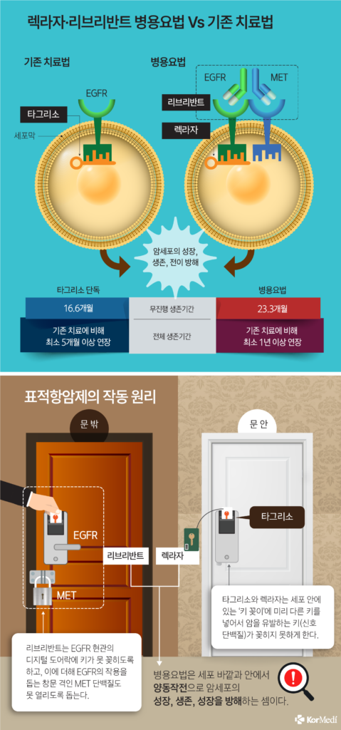 "의사들이 보수적으로 움직이는 것을 비난할 수만은 없다. 폐암의 첫 표적항암제인 이레사도 시판 후 판매중지됐다가 나중에 재개돼 수많은 사람을 살렸고, 타그리소가 표준치료제가 될 때도 많은 시간이 걸렸다. 그러나 곧 변화가 있을 것으로 확신한다. 우선 렉라자·리브리반트 병용요법은 작용 원리가 기존 표적치료제와 다르다. 리브리반트는 EGFR과 MET 돌연변이를 함께 공략하는 데다, 렉라자가 돌연변이 EGFR의 세포 내 작용을 막기 때문에 내성 빈도를 줄인다. 설령 내성이 생겨도 악성도가 강한 것이 생길 확률을 떨어뜨릴 것으로 기대하고 있다. 기존 표준치료제는 세계적으로 폐암 환자의 생존기간을 늘렸지만, 동양인의 생존기간을 서양인만큼 늘리지는 못했다. 병용요법은 동서양인 모두의 전체 생존기간(Overall Survinal)을 1년 이상 늘리고 있다."