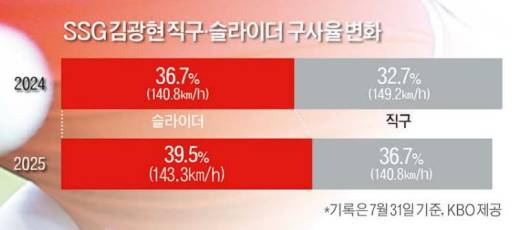 올해 김광현의 주목할 만한 변화 중 하나는 슬라이더 비율이다. 한국야구위원회(KBO)가 제공한 PTS(Pitch Tracking System) 자료에 따르면 31일 기준으로 김광현의 2025시즌 슬라이더 구사율은 전체 투구 대비 39.5%에 이른다. 이는 36.7%였던 전년 대비 2.8%포인트(p)가 오른 것이다.