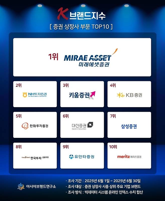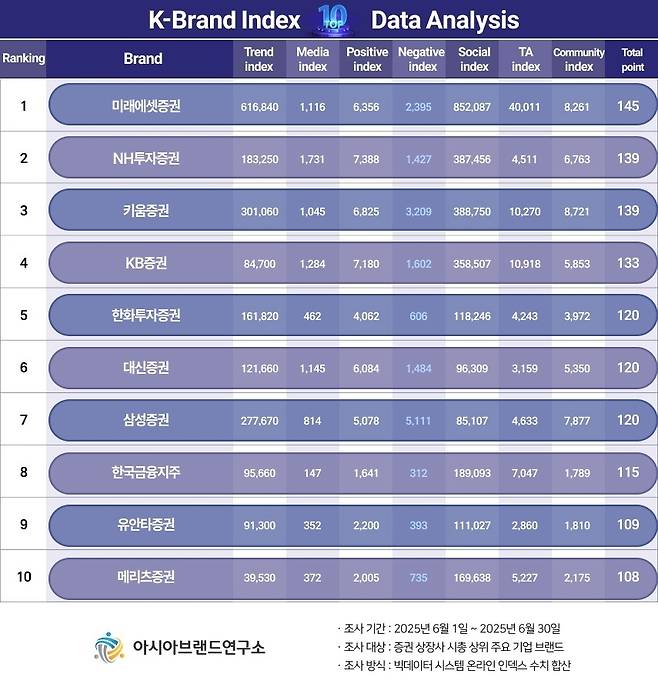 이번 K-브랜드지수 증권 상장사 부문은 증권 상장사 시총 상위 주요 기업 브랜드를 대상으로, 2025년 6월 1일부터 6월 30일까지의 온라인 빅데이터 585만 9601건을 분석했다.