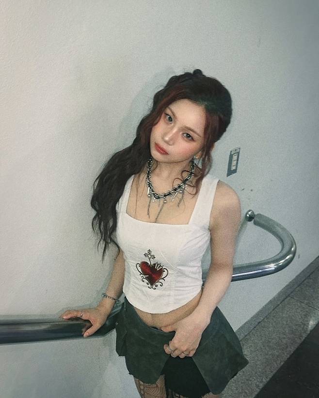 하얀 컬러의 하트 프린팅 톱에 초커형 네크리스, 그리고 빈티지한 가죽 소재 스커트를 매치하며 한층 더 강렬한 인상을 선보인다. 입술을 앙다문 표정과 고개를 살짝 기울인 포즈는 귀여움과 도발적인 느낌을 동시에 안긴다.