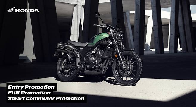 이중 CL500, CBR500R, 레블500은 엔트리 지원 프로모션과 중복 적용 가능하다. 특히, CL500의 경우 60만 원 상당의 용품 구매 지원금이 추가로 주어진다. 이 외에도 2024년식 NX500 구매 시 의류 및 용품 구매 지원금 100만 원 제공, 2024년식 CB650R MT, CBR650R MT는 소비자가 100만 원을 할인한다. 해당 3개 제품 역시 엔트리 지원 프로모션과 중복 적용이 가능하다.