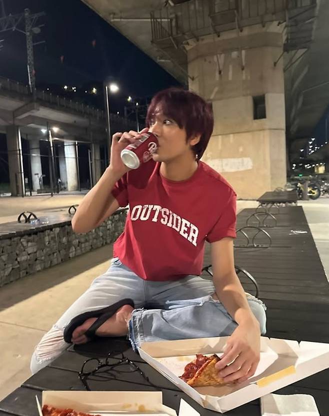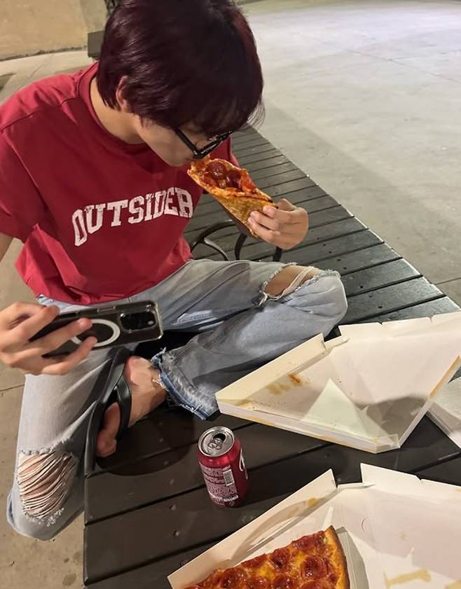 벤치에 앉아 피자와 탄산음료를 먹는 모습은 자유분방한 매력을 더한다. 어디가를 바라보고 촬영한 셀카도 해찬만의 감성을 잘 담고 있다.