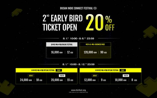 2차 얼리버드 티켓은 온라인 페스티벌, 오프라인 페스티벌(3DAY/1DAY), 비즈니스 패스 전 부문에서 20% 할인 혜택이 제공된다. 온라인 페스티벌과 비즈니스 패스는 오는 6일까지, 오프라인 티켓은 12일까지 예매가 가능하며, 모든 티켓은 BIC 공식 누리집을 통해 구매할 수 있다.