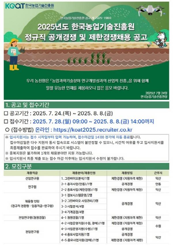 지원서는 8일 오후 2시까지 농진원 채용 전용 홈페이지(https://koat2025.recruiter.co.kr/)를 통해 내면 된다. 자세한 사항은 농진원 공식 홈페이지(https//www.koat.or.kr)에서 확인할 수 있다.