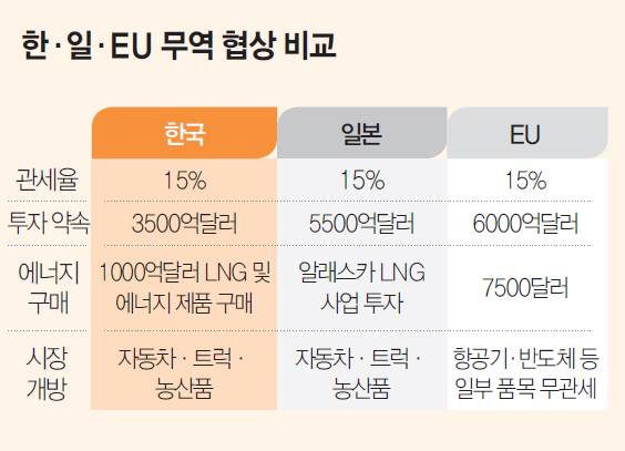 하지만 무역수지를 따지는 미국 논리에 밀렸다. 한국과 일본은 미국과의 무역에서 각각 660억달러, 685억달러 흑자를 냈다. 이에 따라 한국에 대한 투자금이 3500억달러로 결정됐다. 한국은 바이든 정부 시절 미국 현지 설비 투자에 적극 나섰지만 이 내용은 반영되지 못했다.