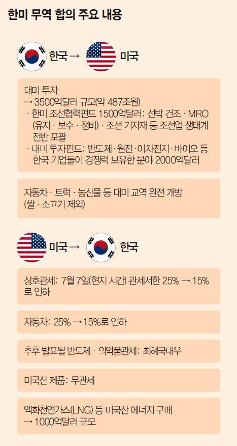 트럼프 대통령은 한국 무역협상 대표단과 만난 뒤 ‘트루스소셜’에 올린 글에서 “미국이 한국과 전면적이고 완전한 무역 합의를 체결하기로 했다”며 “한국은 미국이 소유하고 통제하며 대통령인 내가 선택하는 투자를 위해 3500억달러를 미국에 제공할 것”이라고 설명했다. 이어 “추가로 한국은 1000억달러 상당의 액화천연가스(LNG)나 기타 에너지 제품을 구매한다”고 덧붙였다.