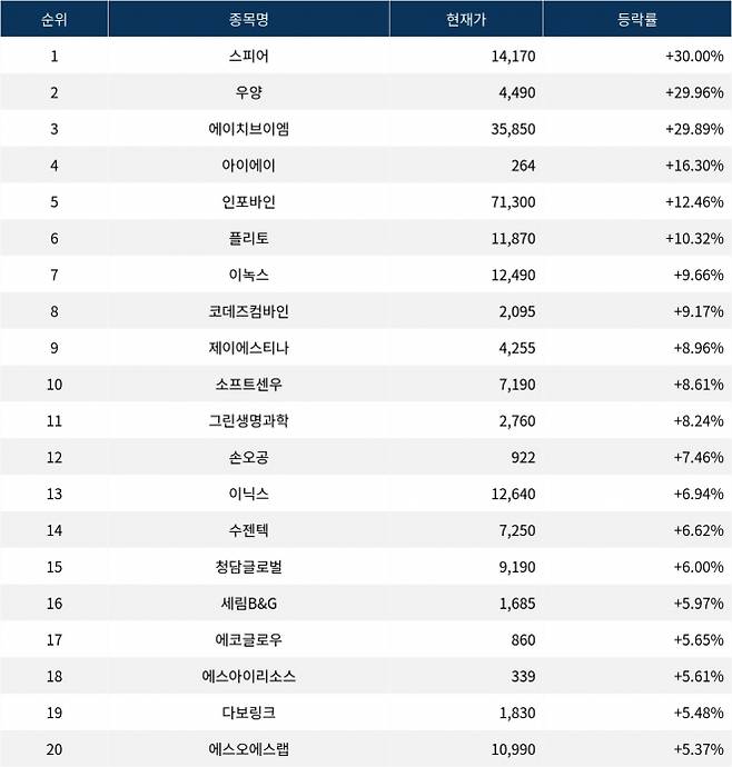 이어 상승률 2위 우양(103840)은 주가가 29.96% 폭등하며 종가 4,490원에 상승 마감했다. 상승률 3위 에이치브이엠(295310)의 주가는 35,850원으로 29.89% 폭등하며 강세를 보였다. 상승률 4위 아이에이(038880)는 16.30% 급등하며 264원에 마감했다. 상승률 5위 인포바인(115310)은 12.46%의 급등세를 타고 종가 71,300원에 마감했다.