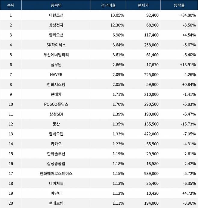 이어 검색비율 2위의 삼성전자(005930)는 하락률 3.50%로 하락 마감했다. 검색비율 3위의 한화오션(042660)은 4.54% 상승 마감했다. 검색비율 4위 SK하이닉스(000660)는 하락률 5.67%의 큰 낙폭으로 하락했다. 검색비율 5위 두산에너빌리티(034020)는 6.40% 하락하며 하락세로 마감했다.