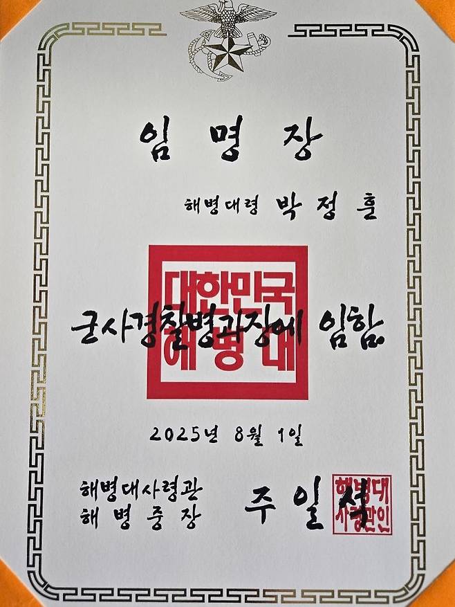 (서울=연합뉴스) 채상병 사망 사건 초동조사 당시 윗선의 수사 외압을 폭로했던 박정훈 해병대 수사단장(대령)이 해병대 수사단장에 복직한 데 이어 1일 군사경찰병과장으로 임명됐다. 2023년 8월 2일 해병대 수사단장과 군사경찰병과장 직무대리 보직에서 모두 해임된 지 약 2년만이다. 그는 항명 혐의로 기소됐다가 올해 초 1심에서 무죄를 선고받았고, 이후 사건을 넘겨받은 특검의 항소 취하로 무죄가 확정됐다. 사진은 박 대령이 이날 받은 군사경찰병과장 임명장. 2025.8.1 [임태훈 군인권센터 소장 SNS. 재판매 및 DB 금지]