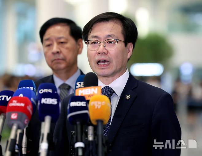 [인천공항=뉴시스] 김진아 기자 = 한미 관세 협상을 마친 여한구 통상교섭본부장이 1일 인천국제공항 2터미널을 통해 귀국, 취재진의 질문에 답하고 있다.