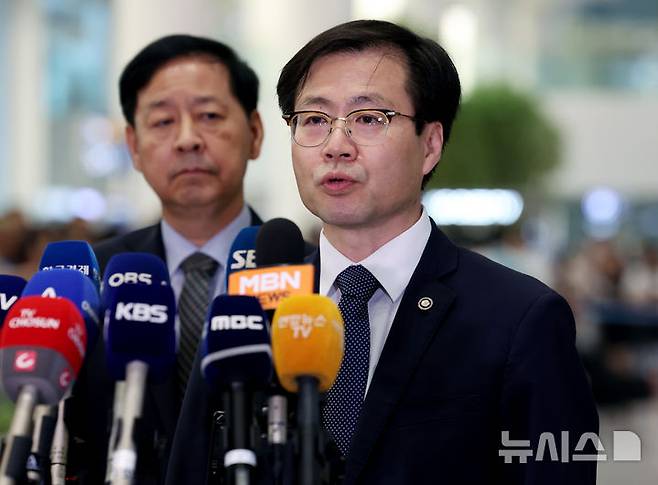 [인천공항=뉴시스] 김진아 기자 = 한미 관세 협상을 마친 여한구 통상교섭본부장이 1일 인천국제공항 2터미널을 통해 귀국, 취재진의 질문에 답하고 있다.