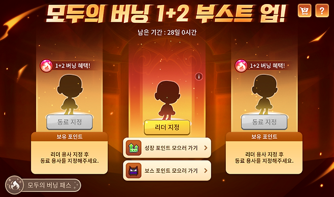 기존 '모두의 버닝' 이벤트가 한층 강화되어, 리더 영웅 캐릭터 하나를 육성하면 동료 용사 캐릭터 두 개가 230레벨까지 '1+2 레벨업' 버닝 혜택을 동시에 받는다.