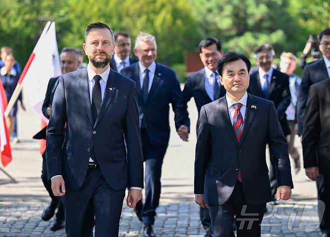 (서울=뉴스1) 김진환 기자 = 안규백 국방부 장관이 1일(현지시간) 폴란드 글리비체 군부대에서 열린 환영행사에서 브와디스와프 코시니악-카미슈 폴란드 부총리 겸 국방부 장관과 함께 이동하고 있다. (국방부 제공, 재판매 및 DB 금지) 2025.8.1/뉴스1