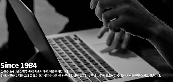 1984년 설립된 산돌은 한국을 대표하는 폰트 개발 기업으로 마이크로소프트의 기본 서체인 ‘맑은고딕’을 개발했고 삼성전자, LG전자, 카카오, 배달의민족 등 다양한 기업의 전용 서체를 제작했다. 또 국토해양부, 행정안전부, 한국디자인진흥원과 ‘한길체’를 공동 개발해 2010년부터 국내 고속도로용 표지판과 도로명 표지판, 지하철과 철도역 표지판에 사용하고 있다.