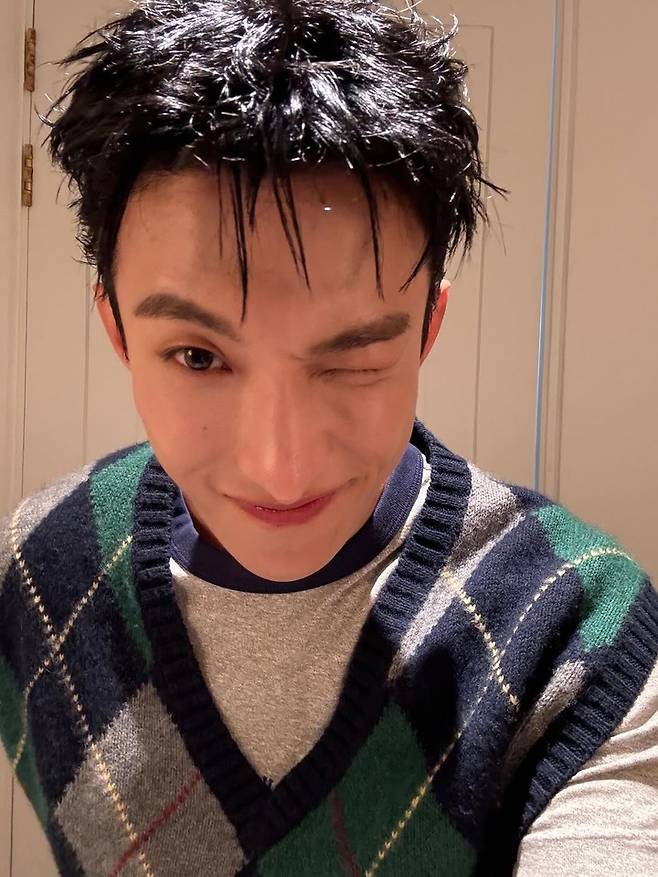 귀여운 윙크와 함께 울프컷 느낌의 젖은 헤어, 그리고 체크 패턴 니트 베스트까지 도겸의 친근하고 유쾌한 매력이 담긴 순간이다.
