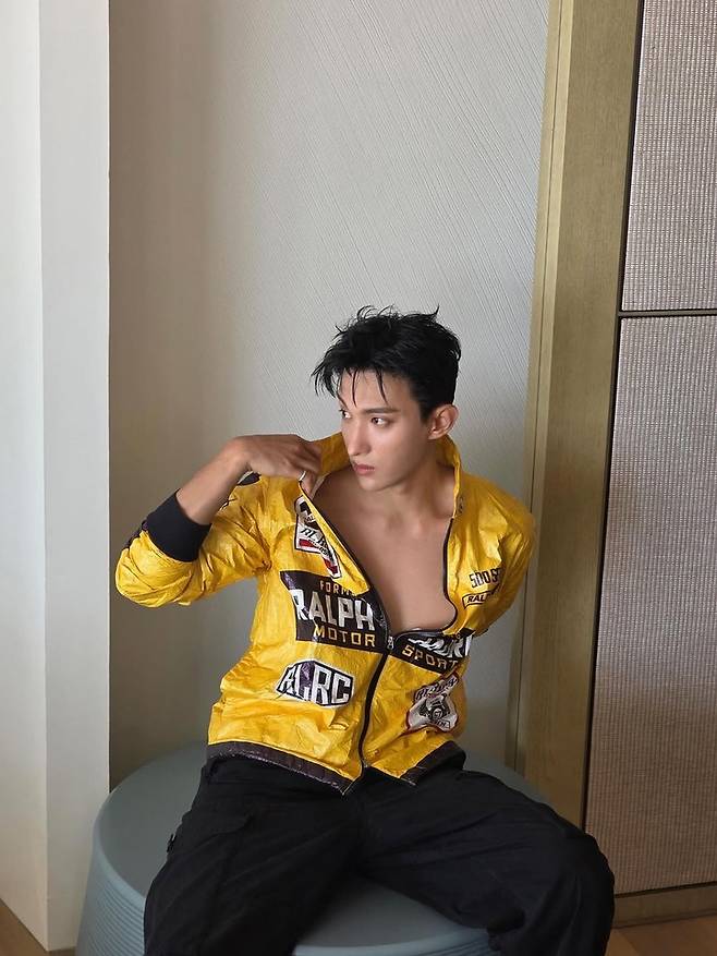 노란색 레이싱 재킷을 입고 셔츠를 반쯤 풀어헤친 도겸은 스포티함과 섹시함을 동시에 드러낸다. 단단한 턱선과 어깨 라인이 돋보이며, 은근한 유혹을 자아낸다.