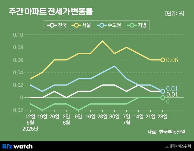 부동산원은 서울 아파트 전셋값 상승률이 지난주와 동일하게 0.06% 오른 것으로 집계했어요. 이번 조사까지 올해 서울의 전셋값 누적 상승률은 1.22%에요. 이는 올해 전체 지역 중 울산(1.64%) 다음으로 높은 상승률이에요.