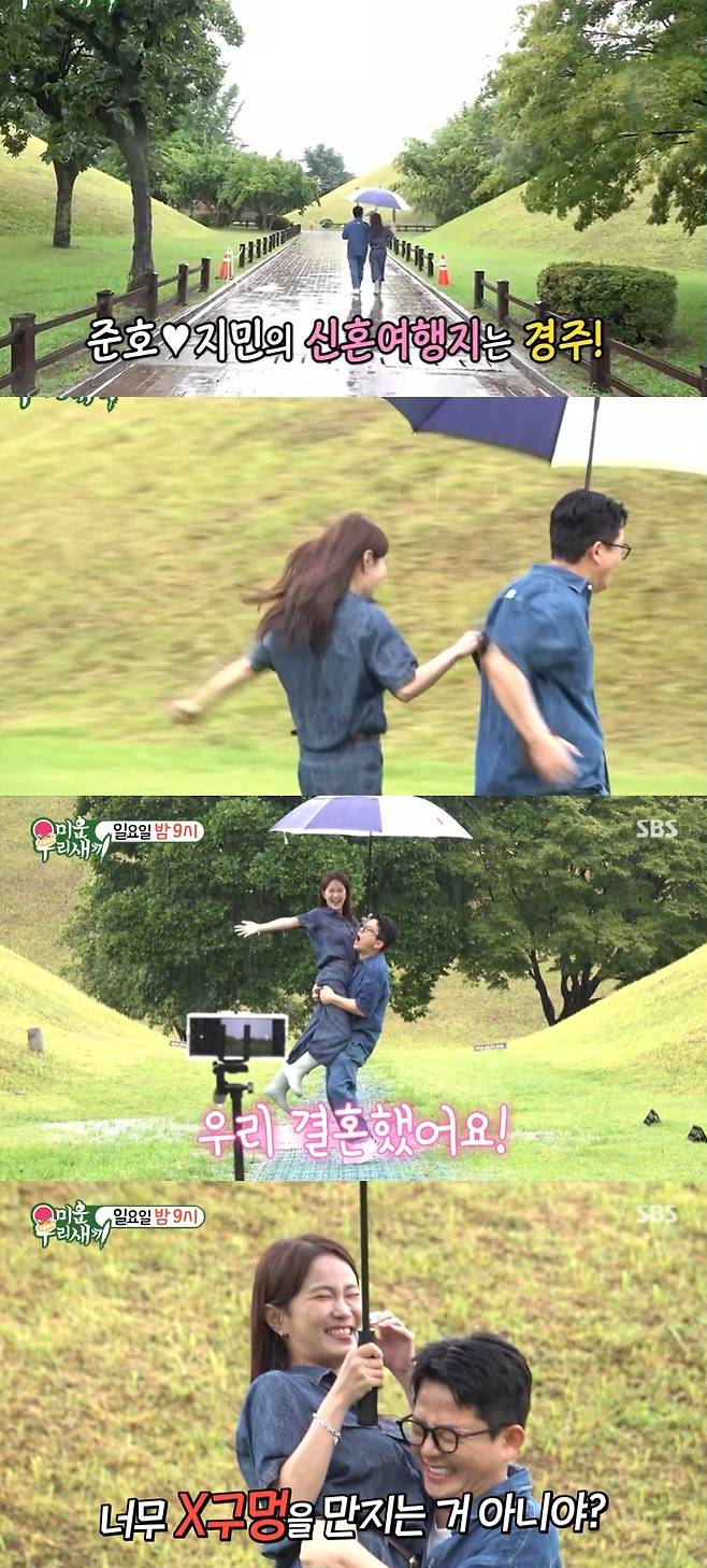 경주로 신혼여행을 떠났던 두 사람은 "이런 국내 신혼여행 좋다"며 시민들에게 결혼 축하를 받은 후 빗속에서 손을 잡고 달리며 달달함을 뽐냈다.