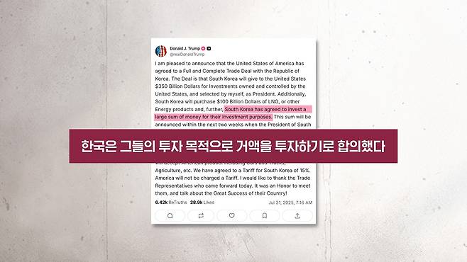 한국·미국 발표의 '공통 분모' 트럼프 대통령의 트루스소셜, 그리고 러트닉 장관의 X(구 트위터), 이재명 대통령의 페이스북, 한국 정부의 김용범 대통령실 정책실장, 구윤철 부총리, 그리고 협상단이 기자들에게 한 설명 등을 통해서 여러 설명이 나왔는데요. 이 내용들을 종합해서 공통적인 부분을 뽑아보면요. 앞서도 말씀드렸지만 (관세가) 15%로 낮아졌다 이겁니다. 그리고 자동차 관세도 15%로 낮추고 또 한국이 3500억 달러 규모를 미국에 투자하고 또 이와는 별개로 1000억 달러 규모의 LNG 및 기타 에너지 분야를 구매를 한다, 이렇게 크게 세 가지라고 이렇게 보시면 됩니다.