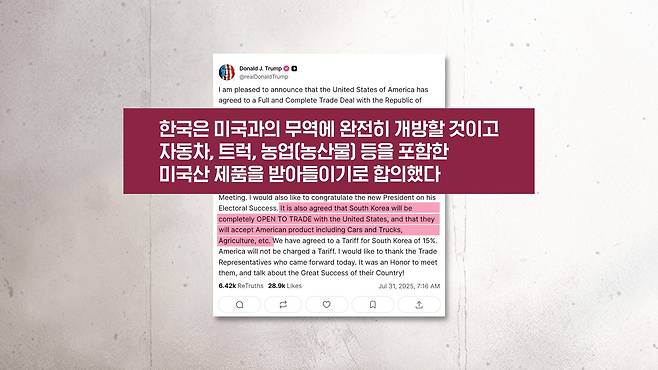 트럼프 대통령은 트루스소셜에 한국이 미국산 '농산물 등을 받아들이기로 했다, 즉 수용하기로 했다'고 밝혔지만, '농산물 개방'이라는 표현은 쓰지 않았습니다. 이미 한국은 미국산 농축산물의 99.7%를 개방한 상태로, 쌀과 소고기 등 민감 품목은 이번에도 제외됐습니다. 트럼프 대통령의 발언은 이런 현실을 정치적으로 부각한 표현으로 보입니다.