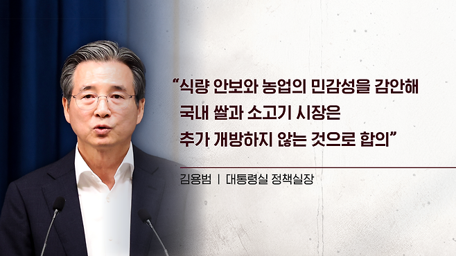 이에 대해서 김용범 대통령실 정책실장은 "식량 안보와 농업의 민감성을 감안해서 국내 쌀과 소고기 시장은 추가 개방하지 않는 것으로 합의했다"라고 밝혔습니다.