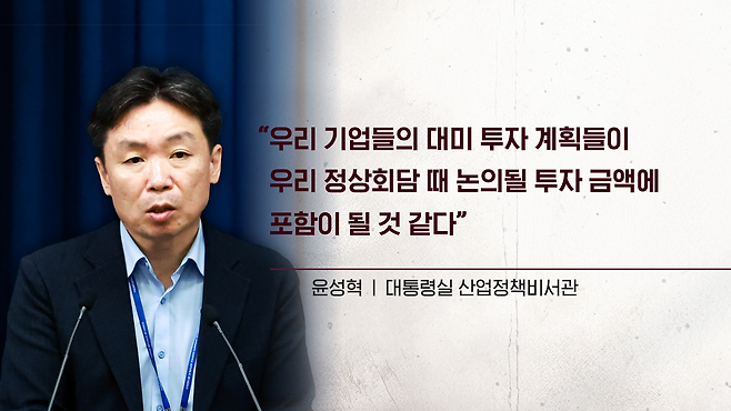 대통령실 기자회견에선 한 기자가 이렇게 질문을 했습니다. 바이든 행정부 때 우리 기업들이 투자한 금액들이 있는데 이번 협상에서 어떻게 활용이 되느냐라고 물었더니 윤성혁 산업정책비서관이 "우리 기업들의 대미 투자 계획들이 우리 정상회담 때 논의될 투자 금액에 포함이 될 것 같다", "그중에 일부는 예를 들어서 삼성전자의 테일러 팹처럼 바이든 행정부 때 발표가 된 계획도 있다", 이렇게 설명을 했거든요. 실제 대미 투자 패키지에 포함이 될지, 아니면 향후 기업들의 추가 투자 발표에 포함이 될지는 아직 정확히 알기는 어렵습니다만, 어쨌든 기존 바이든 행정부 때 이미 투자가 발표가 됐던 부분에 대해서도 한국 측은 협상 테이블에서 논의를 한 게 아닌가, 하지만 이게 전략적인 측면에서 한국 정부가 세세하게 설명하지는 않는 그런 모습입니다.