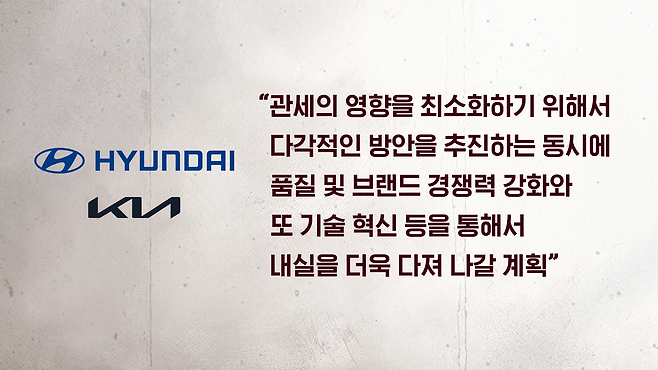 이런 협상 결과를 두고서 현대차와 기아는 "관세의 영향을 최소화하기 위해서 다각적인 방안을 추진하는 동시에 품질 및 브랜드 경쟁력 강화와 또 기술 혁신 등을 통해서 내실을 더욱 다져 나갈 계획이다", 그리고 "정부 각 부처와 국회의 헌신적 노력에 깊이 감사드린다", 이런 입장을 밝혔습니다.