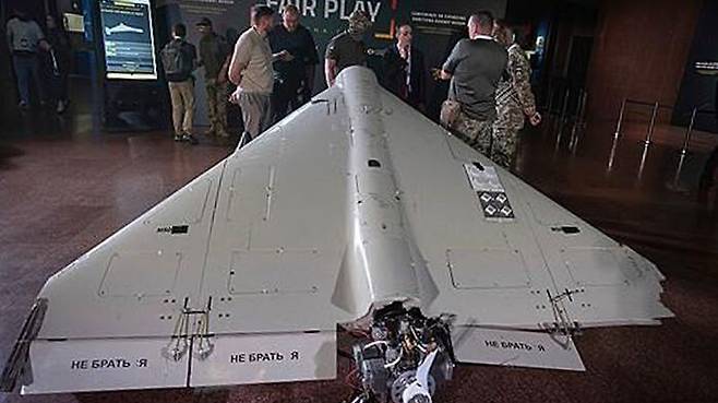 ▲ 우크라이나에서 열린 국제회의장에 전시된 이란제 샤헤드 드론의 모습