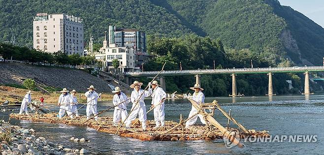 (영월=연합뉴스) 올해로 27회를 맞는 동강뗏목축제 개막 이틀째인 2일 영월군 동강에서 뗏목 시연이 펼쳐지고 있다. '동강, 그 여름의 약속'을 주제로 한 축제는 오는 3일까지 이어진다. 2025.8.2 [영월군 제공.재판매 및 DB 금지]