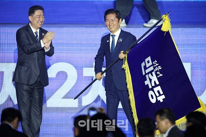 [이데일리 방인권 기자] 정청래 더불어민주당 신임 당대표가 2일 경기 고양시 킨텍스에서 열린 제2차 임시전국당원대회에서 김병기 원내대표로 부터 당기를 이양받고 있다.