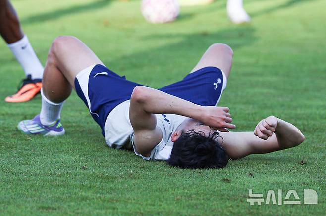 [안양=뉴시스] 권창회 기자 = 잉글랜드 프리미어리그 토트넘 홋스퍼 손흥민이 2일 경기 안양시 안양종합운동장에서 열린 2025 쿠팡플레이 시리즈 토트넘 오픈 트레이닝에서 훈련 도중 쓰러져 있다. 2025.08.02. kch0523@newsis.com