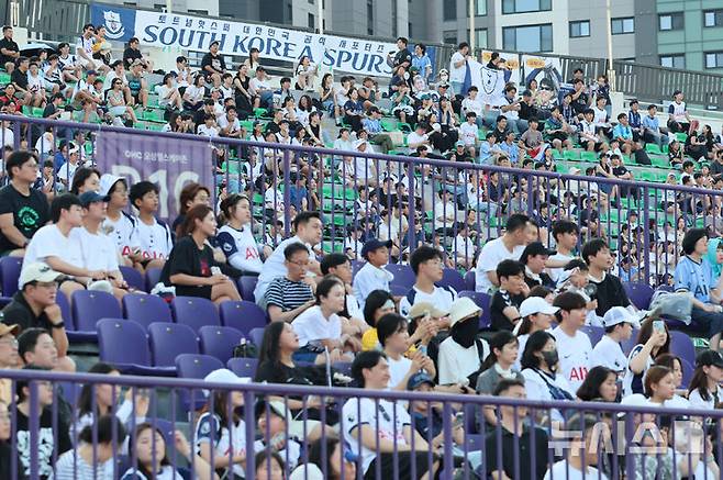 [안양=뉴시스] 권창회 기자 = 2일 경기 안양시 안양종합운동장에서 열린 2025 쿠팡플레이 시리즈 토트넘 오픈 트레이닝에서 팬들이 선수들의 훈련을 지켜보고 있다. 2025.08.02. kch0523@newsis.com