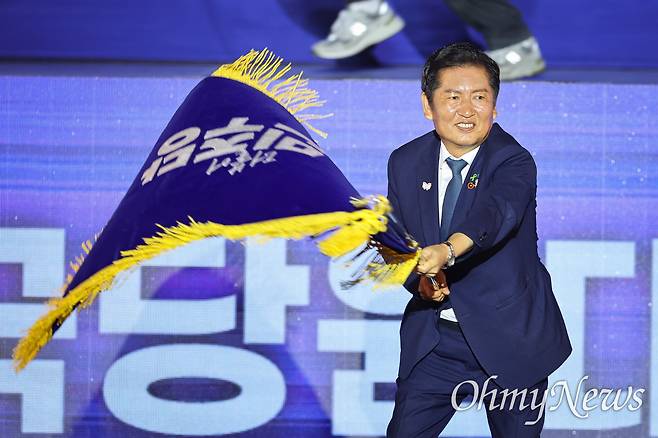 | ▲ 정청래 더불어민주당 신임 당대표가 2일 경기 고양시 킨텍스에서 열린 제2차 임시전국당원대회에서 당기를 흔들고 있다. |