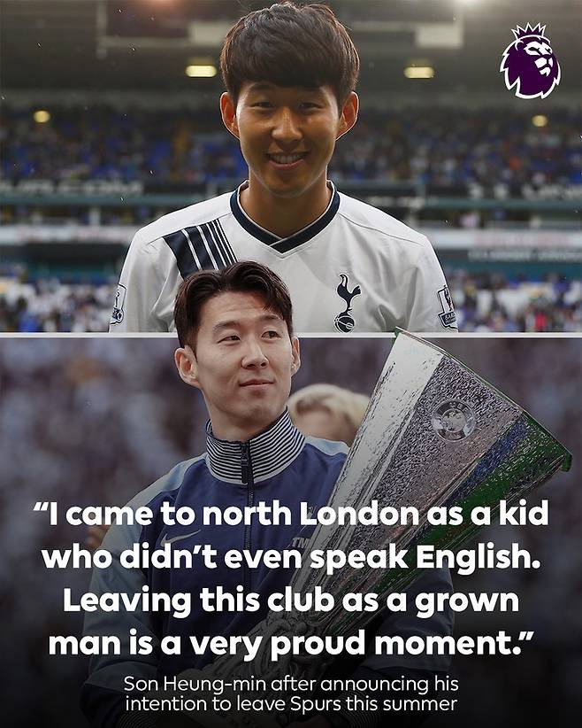 손흥민은 "10년 전 처음 토트넘에 왔을 때 영어도 못했던 소년이 10년 넘게 활약한 뒤 남자가 돼 떠나게 됐다"면서 "작별의 시기가 있다고 생각한다. 지금이 가장 적절한 때인 것 같다"고 팬들에게 마지막 인사를 전했다.