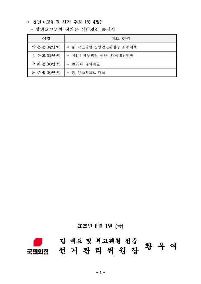뉴시스가 에이스리서치에 의뢰해 7월 27일과 28일 이틀간 조사해서 발표한 여론조사를 보면 국민의힘 대표 적합도는 조경태 23.5%, 김문수 16.8%, 안철수 10.7% 장동혁 9.1%, 주진우 4.2% 순이었습니다. 그러나 국민의힘 지지층에서는 김문수 34.9%, 장동혁 19.8%, 조경태 11.0%, 주진우 8.8%, 안철수 8.0%로 순위가 완전히 달라집니다. (중앙선거여론조사심의위 누리집 참고) 국민의힘 지지층 여론이 실제 전당대회 결과로 이어질 것입니다.