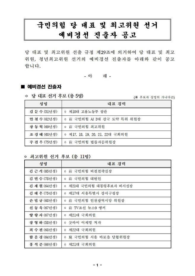 국민의힘 전당대회 예비경선은 8월 5일과 6일 이틀간 당원 투표 50%, 일반 국민 여론조사 50%로 합니다. 대표 후보 4명, 최고위원 후보 8명으로 압축합니다. 본경선은 8월 20일과 21일 당원 투표 80%, 국민여론조사 20%로 합니다. 대표는 과반 득표자가 없으면 8월 24일과 25일 이틀 동안 결선 투표를 합니다. 민주당과 마찬가지로 당원들이 결정권을 갖습니다.