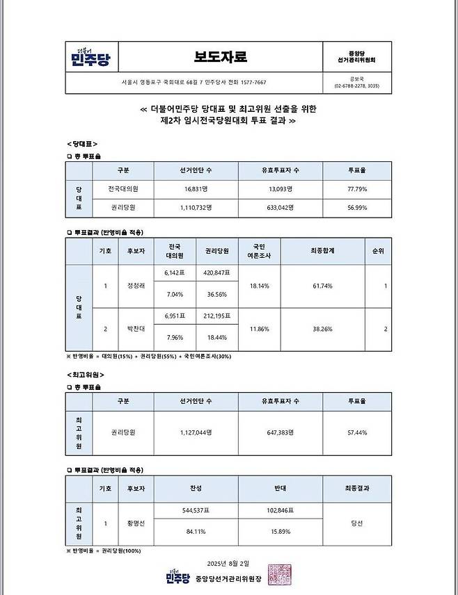 더불어민주당 당원대회에서 정청래 의원이 대표로 선출됐습니다. 정청래 대표는 이재명 대통령의 대표 잔여 임기인 내년 8월까지 민주당 대표직을 수행합니다.