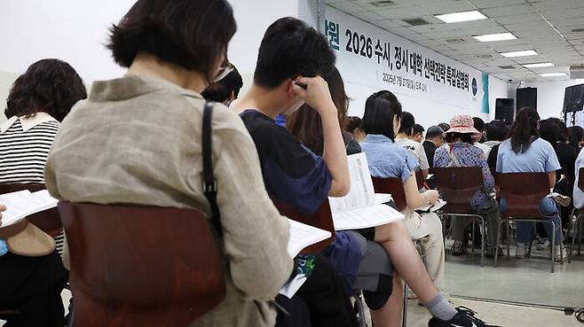 ▲ 지난달 27일 서울 강남구 대치동 종로학원에서 열린 '2026 수시, 정시 대학 선택전략 특집 설명회'에 참석한 학부모와 학생들이 임성호 종로학원 대표이사의 설명을 듣고 있다.