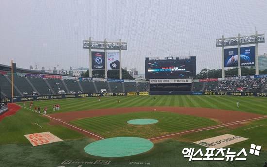 이날 오후 5시 35분 경기 개시 시각(오후 6시)을 앞두고 잠실야구장에 굵은 빗방울이 쏟아지기 시작했다. 결국, 잠실야구장 홈 플레이트 부근과 마운드에 방수포가 깔렸다. 이후에도 빗줄기가 잦아들지 않는 상황 속에서 경기는 오후 6시 20분 지연 개시로 결정됐다.