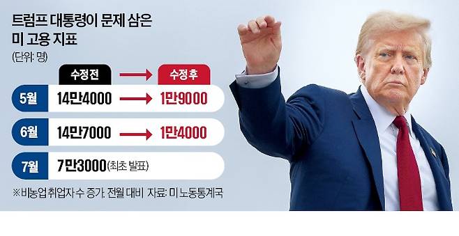 트럼프 대통령의 발언은 이날 노동통계국이 7월 고용(농업 제외) 지표와 함께 5, 6월 고용 수치를 하향 조정한 뒤 나왔다. 노동통계국에 따르면 7월 고용은 전월 대비 7만3000명 늘었다. 시장 예상치(10만 명)보다 적었다. 또 5월에 늘어난 일자리는 당초 14만4000명에서 1만9000명으로, 6월에 증가한 일자리는 14만7000명에서 1만4000명으로 각각 수정됐다. 결국 최근 3개월간 늘어난 취업자는 평균 3만5000명으로 지난해 미국 월평균 취업자 증가분(16만8000명)의 5분의 1에 그쳤다.