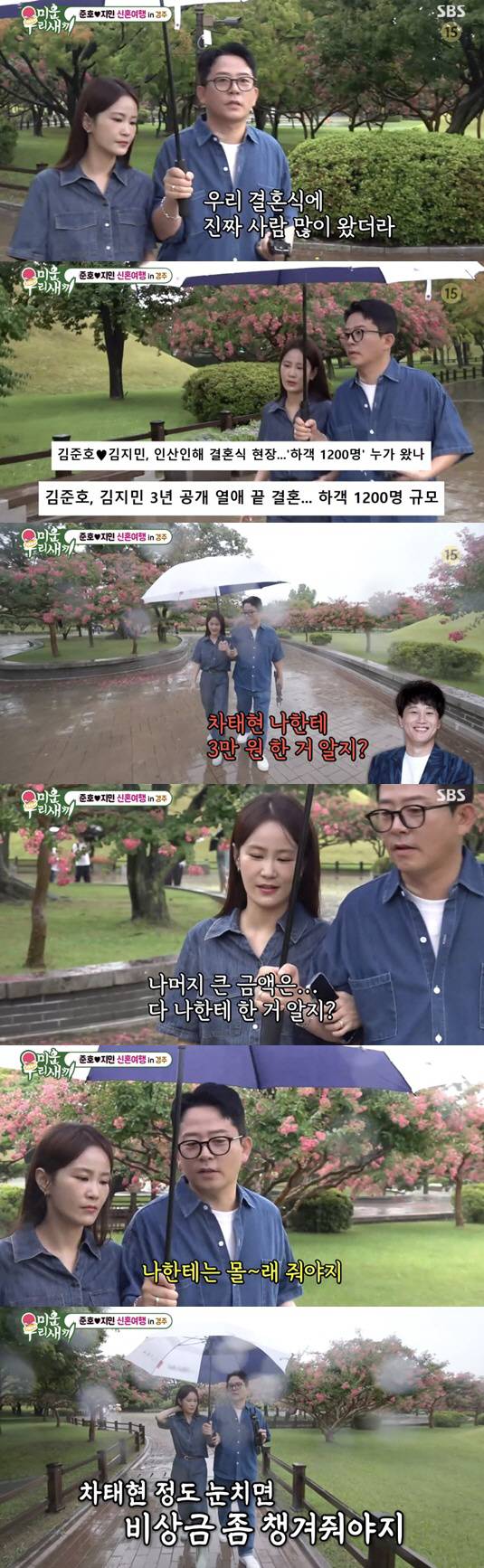 그러자 김준호는 "원래 차태현 정도면 큰 금액은 너한테 내고, 나한테는 몰래 비상금으로 쓰라고 줘야지"라며 투덜거렸다. 김준호는 이후 따질라고 차태현에게 연락을 했다며 "태현이가 5만 원 내면 기억에 안 남을 거 같아서 3만 원 냈다고 하더라"라고 말해 웃음을 자아냈다. 이에 김지민은 "오빠에게 들어온 축의금 중 제일 조금 낸 게 차태현 오빠네"라며 웃었고, 김준호는 "차태현이 최하위다"라고 강조했다.